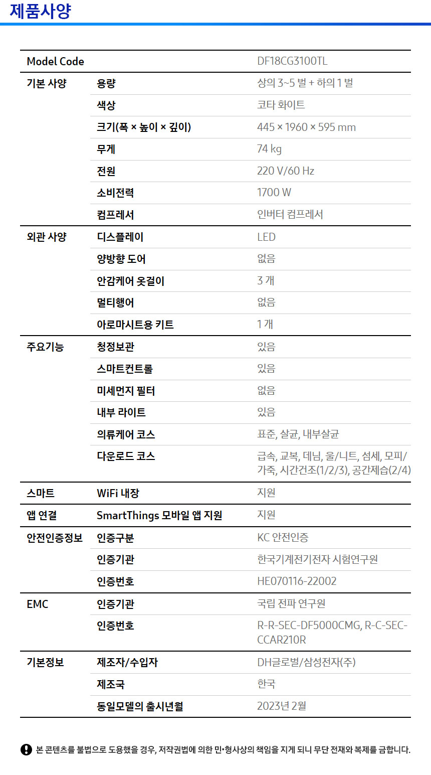 445x1960x595mm, 상의 3~5벌 + 하의 1벌