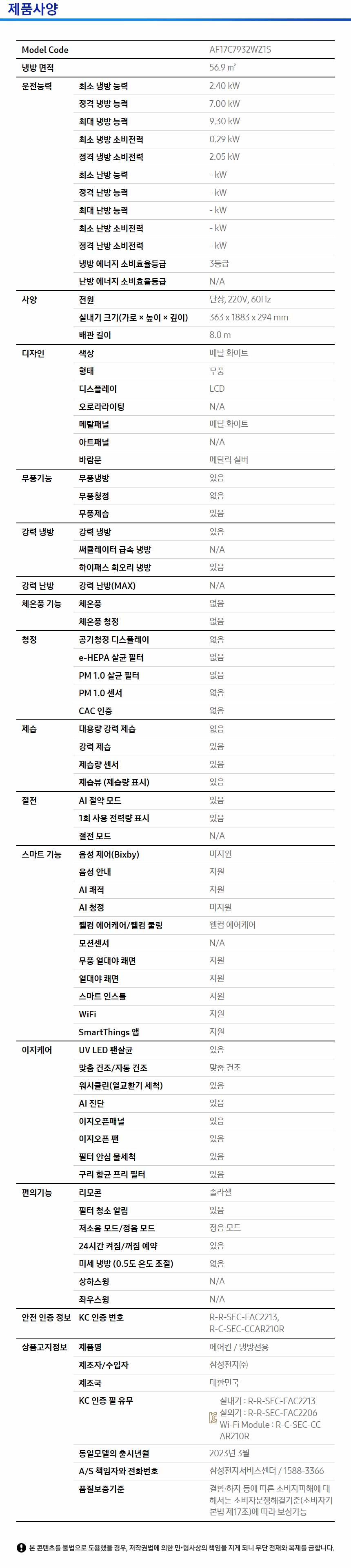 최소 냉방 능력 2.40 kW 정격 냉방 능력 7.00 kW 최대 냉방 능력 9.30 kW 최소 냉방 소비전력 0.29 kW 정격 냉방 소비전력 2.05 kW